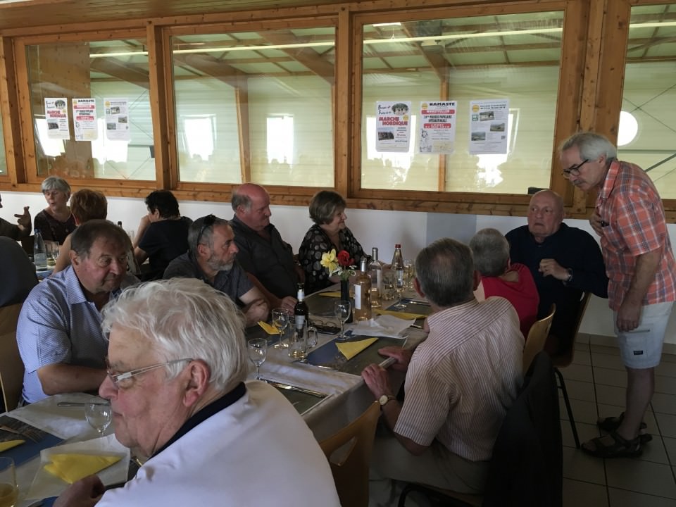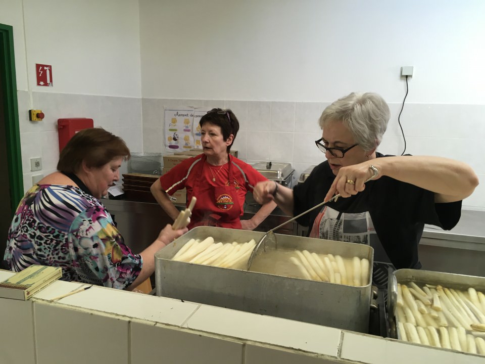 Vers midi, les premières personnes inscrites arrivèrent, suivies des randonneurs. Après un apéro bien mérité, on leur servit également du velouté d'asperges, ce qui a été très apprécié. Puis ce fut le tour de servir les asperges. Ce qui a été fait en un tour de mains.