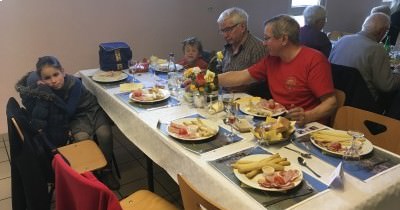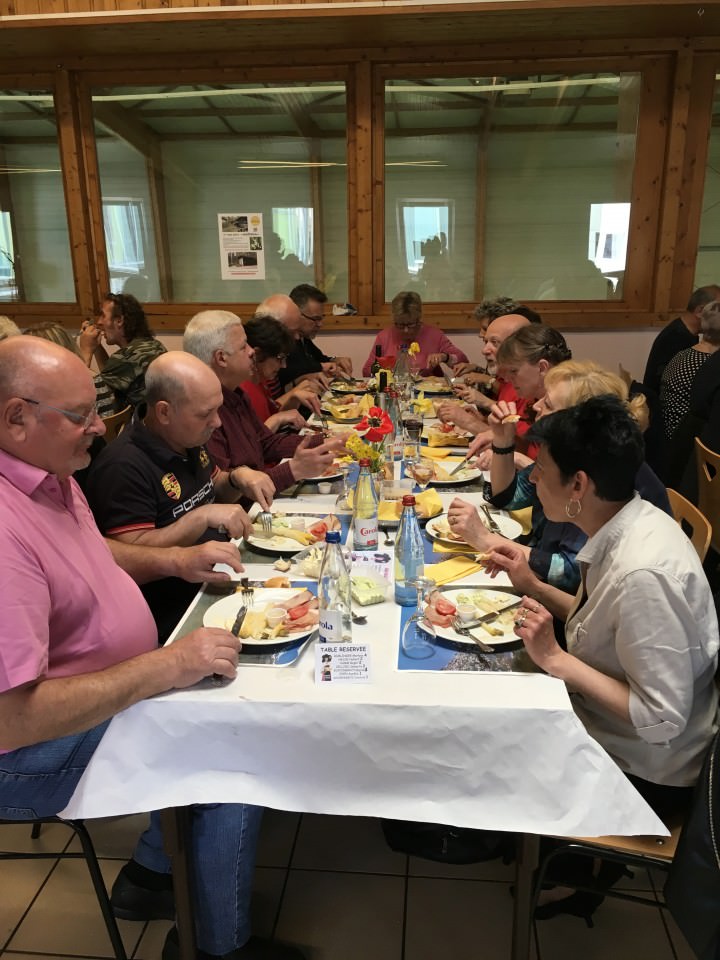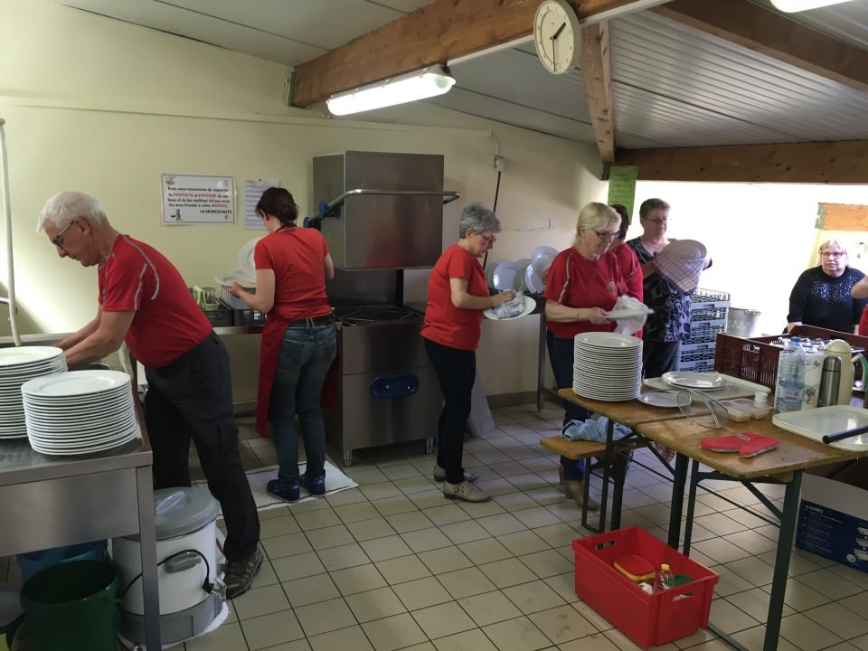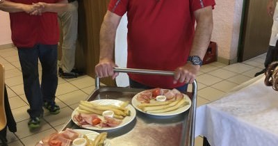 Vers midi, les premières personnes inscrites arrivèrent, suivies des randonneurs. Après un apéro bien mérité, on leur servit également du velouté d'asperges, ce qui a été très apprécié. Puis ce fut le tour de servir les asperges. Ce qui a été fait en un tour de mains.